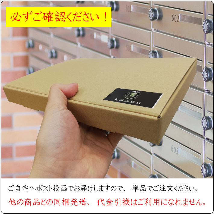 送料無料・メール便にて、ご自宅のポストへ珈琲豆をお届けいたします。たっぷり楽しめる100g×2袋セットです。